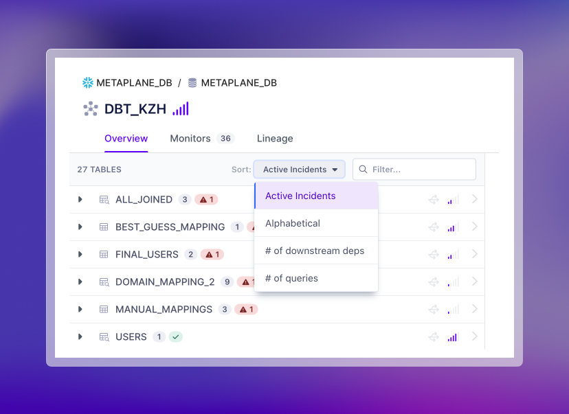 Our latest update is one of those. For a long time, we sorted the children of a warehouse object (the databases in a source, the tables in a schema, and so on) by the number of active incidents on the child object. This was great, because you could see what databases, schemas, tables, or columns might need attention. This was also bad, because when you’re looking for something in particular, a list sorted by the number of active incidents was not very easy to parse.